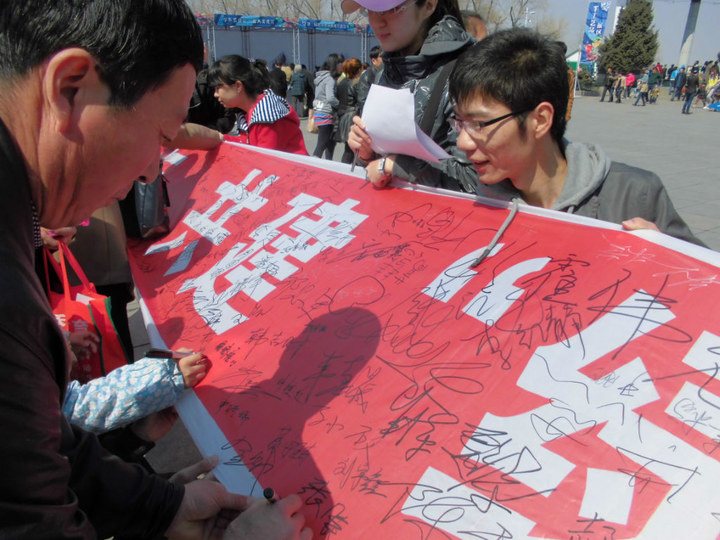 人,分别向市民免费发放环保购物袋,并向其讲解保护母亲河的意义;进行大型的万人签名活动,呼吁市民在签名条幅上签名,并写下他们对松花江母亲河的寄语;设置宣传展板及条幅,增强保护母亲河的宣传力度。