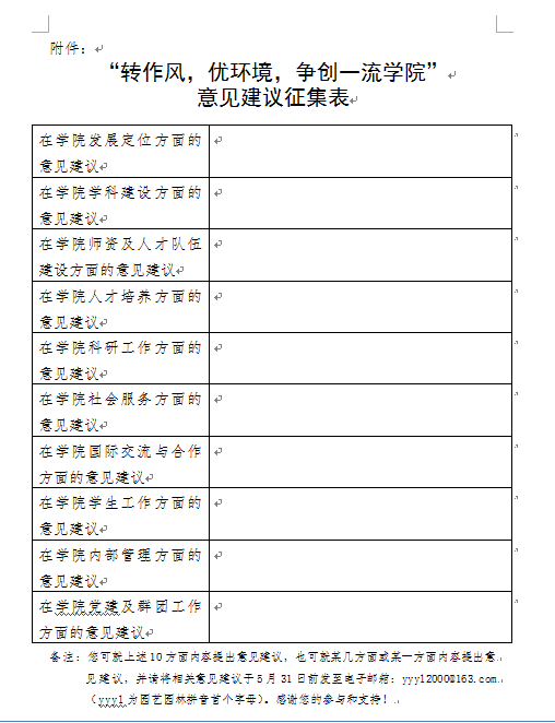 三、为便于师生员工提交意见建议,学院设立意见建议征集电子邮箱,邮箱地址:yyyl2000@163.com,阶段性征集截止到5月31日。此后该邮箱将作为学院书记、院长意见建议征集邮箱,常态化用于接收学院广大师生员工的意见和建议。意见建议征集表可在学院网站公告栏下载。