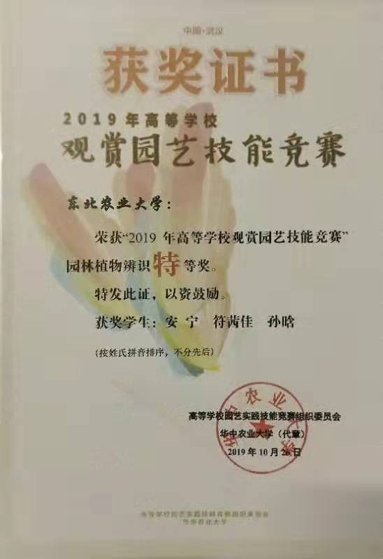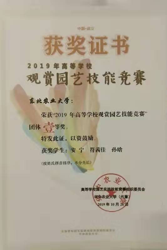 由教育部观赏园艺专业教学指导分委员会主办,华中农业大学承办的首届大学生观赏园艺技能竞赛于10月25-27日在湖北武汉举行,来自中国农业大学、西北农林科技大学、南京农业大学、华中农业大学等全国21所高等院校的63名学生参赛。我校2138cn太阳集团城的刘慧民教授率孙晗、符茜佳、安宁3名同学代表我校参加了此次竞赛。经过激烈紧张的比拼,我校代表队勇夺大赛团体一等奖,园林植物辩识特等奖。刘慧民教授获评优秀指导教师。