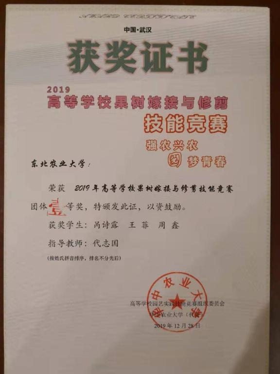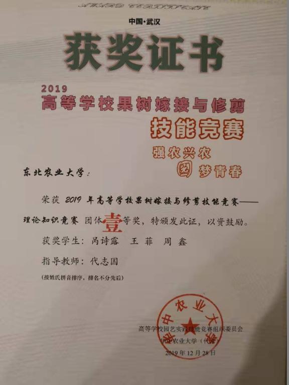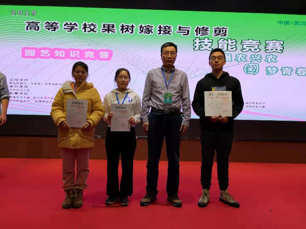 由高等学校园艺实践技能竞赛组织委员会主办,华中农业大学承办的2019年高等学校果树嫁接与修剪技能竞赛于日前在湖北武汉成功举办。来自中国农业大学、西北农林科技大学、南京农业大学、华中农业大学等全国22所高等院校的66名学生参赛。我校2138cn太阳集团城代志国副教授带领呙诗露、王菲、周鑫3名同学代表我校参加此次竞赛。经过激烈紧张的比拼,我校代表队分别荣获果树嫁接与修剪技能、理论知识两个团体竞赛一等奖。