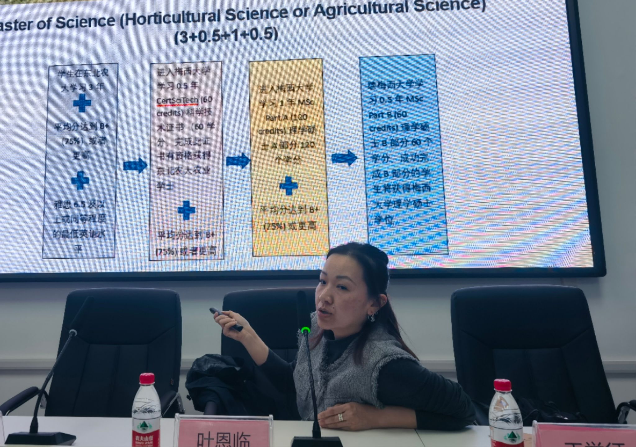 叶恩临老师从办学规模、校园文化、学术交流、大学创新、国际学生招生、服务园艺产业等方面介绍了梅西大学基本情况。并对中新园艺实验班在梅西大学培养阶段的课程设置、英语等级要求、攻读硕士可选的专业领域、学生服务、校园生活、国际学生活动及收费标准等进行详细说明。