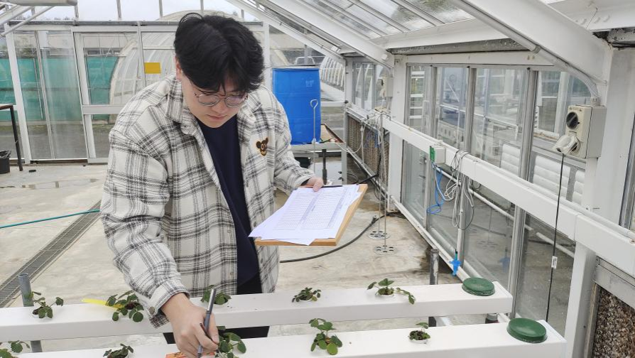图1李彦博在梅西大学Plant Growth Unit玻璃温室测量草莓生理指标