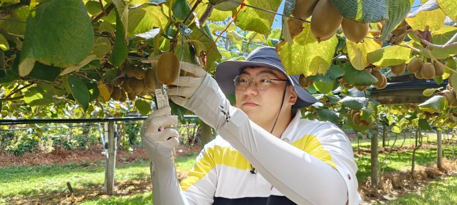 图2李彦博在梅西大学Plant Growth Unit猕猴桃园测量果实生理指标
