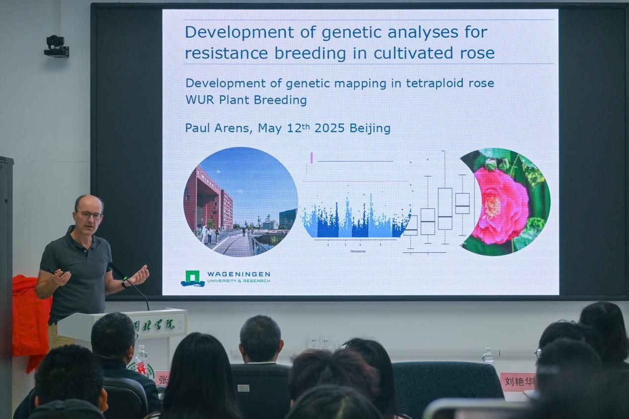 Paul Arens研究员以“栽培月季抗性育种的遗传分析进展”为主题,以四倍体玫瑰植株育种遗传图谱的建立为主要切入点展开论述,详细介绍了玫瑰的杂交育种方法建立及其他前沿研究进展,针对玫瑰常见病问题做了分析。对月季植物育种新方法及抗病育种的策略开发进行了深入讲解,拓宽了学生们的专业视野,进一步加深了学生们对专业知识的理解。