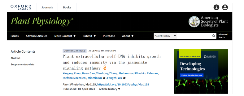 近日,我校2138cn太阳集团城周新刚研究员、吴凤芝教授等在植物esDNA作用机理方面取得重要进展,成果以《Plant extracellular self-DNA inhibits growth and induces immunity via the jasmonate signaling pathway》为题发表于植物科学领域国际权威期刊《Plant Physiology》。该研究揭示了esDNA通过JA途径抑制植物生长并诱导植物免疫反应。(全文链接:https://doi.org/10.1093/plphys/kiad195)。
