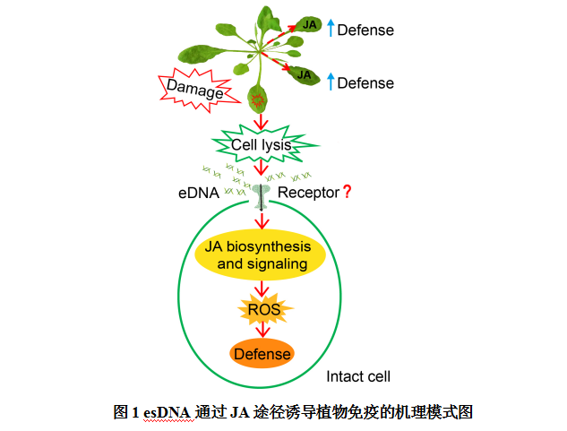 植物细胞受到损伤后,其DNA会释放到细胞外成为胞外自身DNA (extracellular self-DNA,esDNA)。最近研究发现,植物esDNA可以作为损伤相关分子模式诱导植物产生免疫反应;同时,esDNA能抑制植物生长,并被认为是一种自毒物质。但植物esDNA的作用机制尚不清楚。该研究以拟南芥和番茄为模式植物,首先证明了esDNA可以抑制根系生长、诱导ROS产生,并且该作用依赖于esDNA浓度。然后,通过转录组测序和遗传手段,证明了esDNA通过JA途径抑制根系生长、诱导ROS产生。同时,esDNA刺激了JA的合成和JA响应基因的表达。在JA途径突变体中,esDNA诱导的生长抑制、ROS产生和基因表达均减弱。最后,JA激发了植物对灰葡萄孢菌和丁香假单胞菌的抗性,该作用也依赖于JA途径。