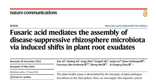 近日,我院研究员周新刚等与多家单位合作,在解析土传病原真菌与植物互作机理方面取得新进展,成果以《Fusaric acid mediates the assembly of disease-suppressive rhizosphere microbiota via induced shifts in plant root exudates》为题发表于在国际著名期刊《自然•通讯》 (Nature Communications)。该研究揭示了番茄枯萎病菌产生的镰刀菌酸通过诱导番茄根系分泌物变化从而调控根际微生物组抑病力。